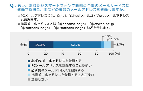 「必ずPCメールアドレスを登録する」「PCメールアドレスを登録することが多い」を合わせると8割を超え、「必ず携帯メールアドレスを登録する」は2.9%に留まりました。