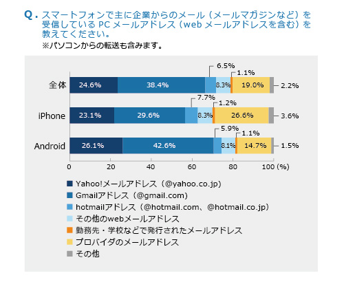 【スマホで企業からのメールを受信しているPCメールアドレス】iPhone、Androidともに「Gmailアドレス」がトップ