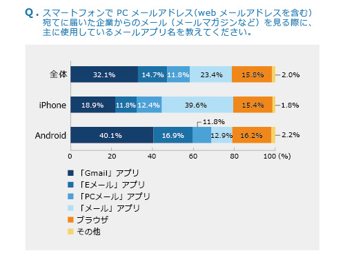 アンケート結果では前者40.1%、端末製造メーカーがプリインストールしている「Eメール」アプリ、「PCメール」アプリ、「メール」アプリなどの合計が41.6%となりました。