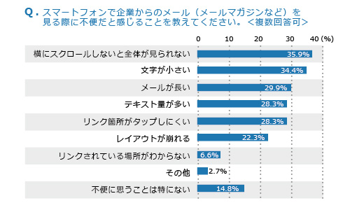 全体では、「不便に思うことは特にない」との回答が、14.8%となり、何かしら不便を感じている回答は、85.2%に上りました。「横にスクロールしないと全体が見られない」、「文字が小さい」などの回答が多く、企業が配信しているメールの多くがスマホには最適化されていないようです。