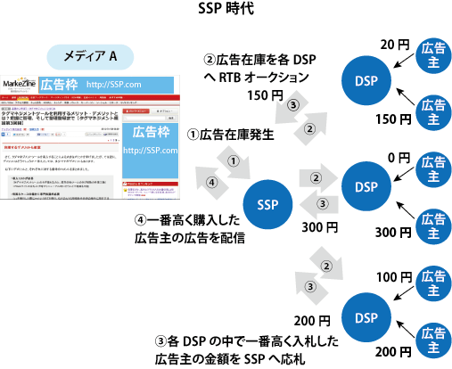 RTBの仕組みを利用するにはSSP(Supply-Side Platform:媒体が登録し、オークションを開催する仕組み)とDSP(Demand-Side Platform:RTBオークションで広告を買う仕組み)の二つが必要です。これにより、媒体社はSSPを利用することで、1インプレッションを一番高く販売することが可能になり、広告在庫の単価アップにつながります。