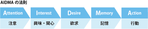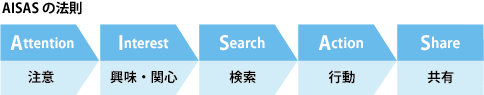 最近は、AISAS(アイサス)というのも有名ですね。これは、Attention(注意)→ Interest(興味・関心)→ Search(検索)→ Action(行動)→ Share(共有)と至るプロセスです。