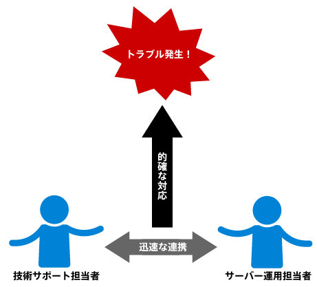 「当社の技術サポート担当者とサーバー運用担当者は、同じグループに所属しており、物理的にも近い距離にいます。そのため、トラブル時にもスピーディに情報を共有でき、的確な対応を迅速に行うことができます。お問い合わせから24時間以内の対応を心がけ、実践できているのは、そうした人的なサポート体制が整っているからと言えるでしょう」
