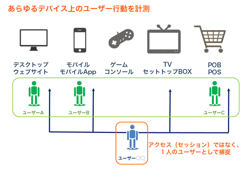 ユニバーサル アナリティクスの最大の特徴は、マルチスクリーンにおけるセッションを超えたユーザーの解析機能です。ユーザーのアクセスを今までのように「セッション」という捉え方だけではなく、「1人のユーザーの動き」として捉えることができます。1人のユーザーがさまざまなデバイスからアクセスしてきた場合、同一ユーザーのセッションとしてデータを収集し、これによって今まで複雑で困難であったマルチスクリーン解析、マルチデバイスにおけるユーザーアクセス解析が容易に実現可能になります。