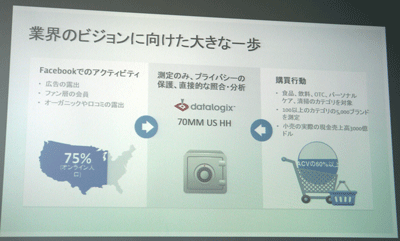 ここで、ダグ氏は米国でのFacebookにおけるユーザーのアクティビティとオフラインの購買データーを組み合わせた、データロジックス社の事例を提示した。