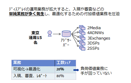 そこで同社では、買い付けと配信効率の最大化を横断的に計算できる最適化エンジンを開発し、同時に中国・大連に業務センターを開設した。東京ではアナリスト3名が最適化エンジンを扱い、大連ではオペレーター11名が各種アドサーバー上の管理画面を扱うという体制を整えた。