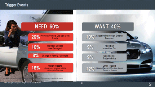 Auto Trader.comは、中古車の買い手と売り手をマッチングさせる、いわゆる中古車検索サイトだ。「このビジネスモデルで重要なのは、Trigger to the Market(購入のきっかけ)を見つけることだ」とHernalsteen氏は言う。つまり、子供が生まれた、子供が大学に入った、車が壊れたなど、消費者のニーズ(必要性)とウォンツ(欲求)を理解して、適切な施策を行うことが重要ということだ。