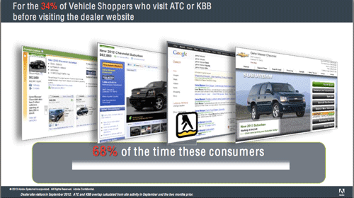 しかし同時に、複数サイトをまたいだユーザー行動をみると、34%の車の購入者は中古車サイトで充分に検討した後、ブラウザのツールバー上のGoogle検索窓から近くのディーラーを検索し、ディーラーサイトに訪問していることも判明した。さらに、中古車サイトを訪問せずに直接ディーラーサイトへ訪問した際の直帰率が34%であるのに対し、中古車サイトを経由した際の直帰率は12%。また在庫確認まで至ったユーザーは、直接訪問で62%であるのに対し、中古車サイト経由では80%という結果に至った。