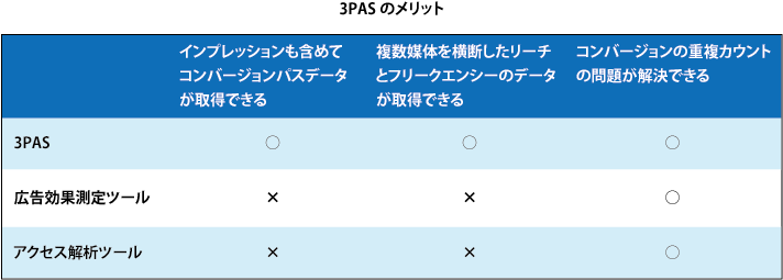 インターネット広告のアトリビューションという観点では、3PASがアクセス解析ツールや広告効果測定ツールよりも優れているということになります。しかし、もちろん、サイトの解析をする場合などは、アクセス解析ツールの方が優れています。用途によって使い分けなければなりません。また、最近は、3PASとアクセス解析ツールなどを連携することによって、広告配信のインプレッションから広告のクリック、そして広告主企業サイトへのアクセス後のユーザーの動きも一気通貫でトラッキングできるようになってきています。