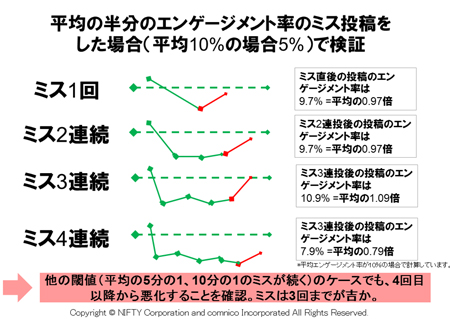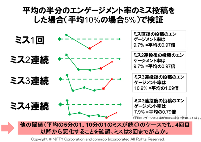 結論としては、3回連続のミスまではエンゲージメント率に影響はないものの、同じようなミス投稿を4回以上続けてしまうと、その後の投稿のエンゲージメント率にも影響を与えてしまう可能性が高くなることがデータから確認できました。