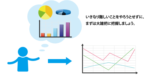ですから、まずは大雑把に把握して、その後で詳細に掘り下げていくことが大切なのです。最初はPVだったり、売上、資料請求数など、サイトが達成すべき目標をベースに大雑把に把握してみると良いでしょう。