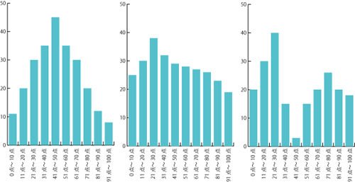 下記の図を見てみましょう。一見、まったく異なるグラフに見えますね。でも、これはすべて平均が同じグラフなのです。