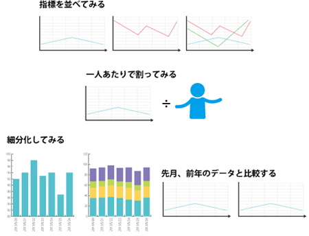 たとえば売上推移のグラフを見て、売上が下降気味だった場合、「なぜ下がったのか」という質問に関しては、売上推移のグラフだけ見ても答えは出ません。複数の数値で比較してはじめてその原因がわかるのです。私が比較する際は下記の4つを利用して、比較しています。