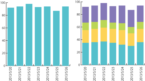 売上を商品のカテゴリ別で積み上げグラフにしたときに、特定カテゴリの売上が下がっていた場合、問題箇所の特定ができます。他は横ばいなのに、そのカテゴリのみ下がっているのであれば、全体的な流入数の現象を疑うよりも、在庫切れの期間が長かった、その商品に魅力がなくなった、別の新製品がライバル会社から出されたなど、理由を絞っていくことができます。