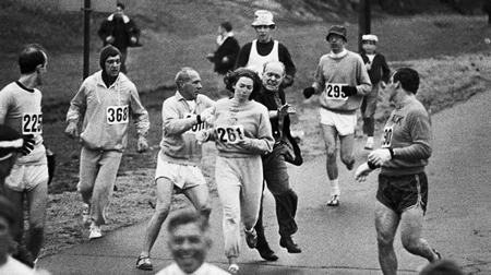会場では、市民マラソンは男性のスポーツであった米国の歴史の中で、女性で初めてボストンマラソンに参加したKathrine Switzer氏の動画の一部が紹介された。当時を語るSwitzer氏と沿道を走る彼女を、男性が無理矢理コースから引きずり出そうとしている白黒の写真から構成されているこの動画は、メッセージ性の強いものだった(動画:First Woman to Enter the Boston Marathon)。