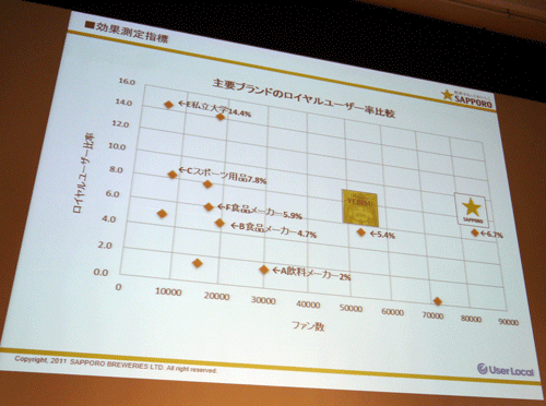 上記の表は、横軸がファン数で、縦軸がロイヤルユーザー比率です。エビスが5.4%、サッポロビールは、この時8万人超えのファンがいて、6.7%でした。
