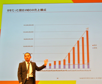 売上全体は2007年から2012年までで5倍に成長している。「よく見てほしいのは、青い部分が新規顧客、赤い部分が既存顧客。つまり既存顧客にちゃんとリピートしてもらう仕組みをつくったことで売上が大きく伸びる結果となった」。西井氏は「同じような問題を感じている人は、今すぐ自社の顧客の状況を調べて手を打ってほしい」と語った。
