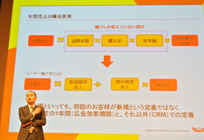 ECの売上は、訪問者数×購入率×客単価でできている。大事なのは「年間にどれだけリピートして購入してもらうか」。さらにユーザー軸で考えると、「新規顧客」の売上と「既存顧客」の売上がある。既存顧客の売上で重要なのは「継続率」だ。そこを詳しく調べていった。
