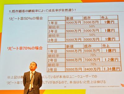 「リピート率50%と70%では成長率がまったく違う」と西井氏は言う。新規顧客の売上が5000万円、既存顧客の売上が5000万円とすると、リピート率が50%の場合、毎年新規で売上5000万円をたてても、何年たっても売上は変わらない。一方、リピート率が70%の場合は、既存顧客の売上が全体を押し上げていく(これは概念上の話で、実際にはユニークユーザーでのLTVで分析する必要があると西井氏は補足した)。