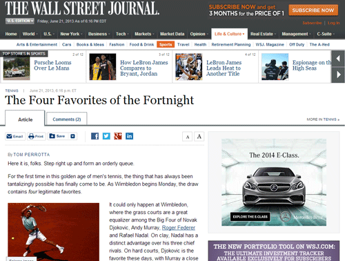 ネイティブ広告を理解するために、具体例を見ていこう。以下のスナップショットは、ウォール・ストリート・ジャーナル(WSJ)サイトの記事である。あるニュース記事の先頭部と後頭部を掲載している。この記事の左側がWSJの編集コンテンツ枠で、右側が広告やお知らせのための枠となっている。