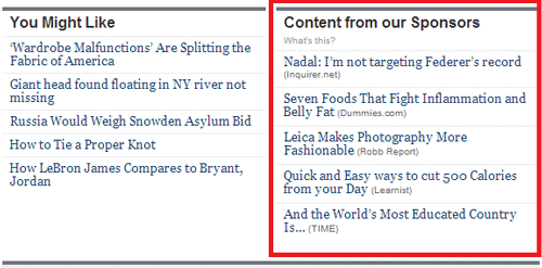 ニュース記事の後頭部には、このニュース記事の閲読者が関心を持ちそうな他の記事や、そのニュース記事と関連のありそうな他の記事をレコメンドしている。 左側の「You Might Like」ではWSJの他記事(見出しとリンク)を載せ、右側の「Content from our Sponsors」ではWSJ以外の外部記事を紹介している。
