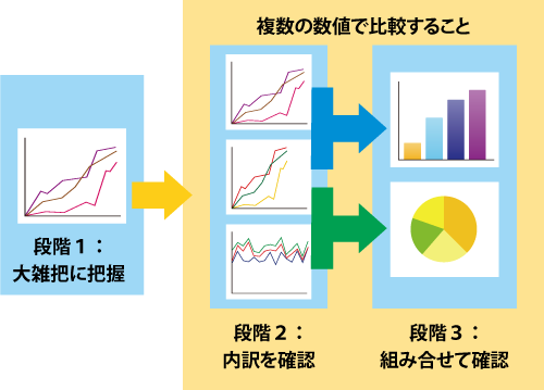 直接施策に結びつく結論が見いだせない場合、なぜ数値が下がっているのかわからないような場合、さらに深掘りする必要があります。以下の図のような流れで、まず大雑把に把握したうえで、複数の数値を比較していきましょう。