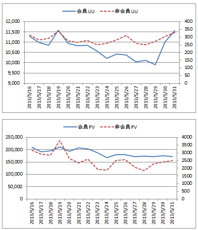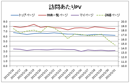 詳細画面への会員UUは前半の水準に戻ってきましたが、下のグラフで会員の訪問あたりのPVを見ると、前半では18前後だったものが、15近くに下がってきています。わずか3の違いではありますが、母数が大きいのでPVの伸び悩みの大きな原因となっているようです。このまま下落していくと、いくら誘導してもPVが稼げなくなりますから、会員がもっと多くの詳細画面を見てもらうように改修しなければなりません。非会員もUUは微増か横ばいで、PVも踏みとどまっているように見えましたが、訪問あたりのグラフで見ると下がっていることが明らかです。