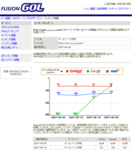 一方、FUSION GOLの「SEO支援サービス」は、効果測定ツールが備えられており、指定キーワードごとの表示ランキングを随時チェックすることができる。
