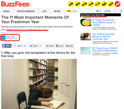 また、ソニーも7月から同サイトのネイティブ広告主になった。新学期を控えて、新入生などにソニーのVaioを売りたいためである。でも現在、投稿している3本の広告記事では、製品についてはほとんど触れていない。新入生が経験するであろうイベントや、入学前に知っておくべきことなどを、興味深い写真やビデオで紹介している。バイラル性を盛り込んでいるため、広告記事なのにソーシャルメディアでも話題になっている。若い人にもソニーブランドに親しみを持ってもらい、Vaioを認知してもらう狙いは達成したのかもしれない。