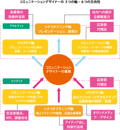 具体的な能力強化策として、3つの軸と6つの方向性という考え方を示しています。3つの軸とは、プロダクト軸/シナリオプランニング軸/コミュニケーション軸です。この3つを軸としてインプットとアウトプットを実行します。それぞれの軸でインプットとアウトプットを行うので、下図のように6つの方向で仕事を進めることになるのですが、それぞれ必要なスキルが異なります。