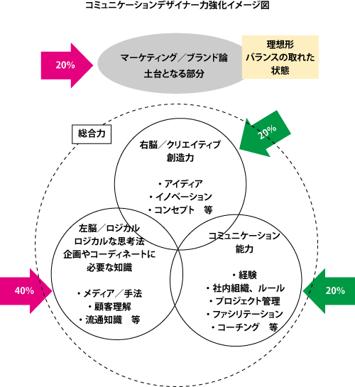 広告部の人材は、コミュニケーションデザイナーになるべきだと考えています。コミュニケーションデザイナーに求められる能力とは、土台となるマーケティング/ブランド論、左脳的な脳力にあたるロジカル思考、右脳的な脳力にあたるクリエイティブ力・創造力、さらには対外交渉を円滑に進めるコミュニケーション能力の4つだと思っています。