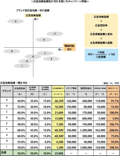キャンペーン評価に関しては、求められることもあり増分利益/投資額のROIでも管理をしておりますが、利益水準には広告以外の要素が多く含まれるため、評価はそれだけではしていません。広告キャンペーン実施後に前述の3つの指標(「認知率」「購入意向率」「実購入率」)を調査し、それを掛け合せた数値を「広告効果指標」として重視しています。広告効果指標軸とROI指標軸の4象限マトリクスにて各キャンペーンをプロットし、評価しております。