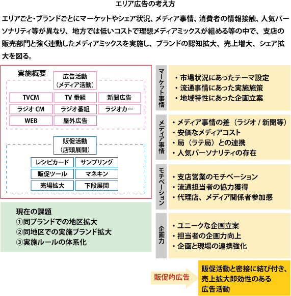 直近の事例では、エリア広告の考え方で実行したエリアマーケティングが成功をおさめました。特定エリア限定でテレビ広告、デジタル、リアルイベントなどを連動させたコミュニケーション活動で、支店の販促部門と強く連動した施策です。対象エリアのテレビ広告やラジオ広告には、そのエリアに在籍する弊社社員が出演しました。結果、メディアと販促部門の方々の熱い思いを広告メッセージや販促行動に掛け合わせることで、流通店舗の棚取りに大きく貢献しました。