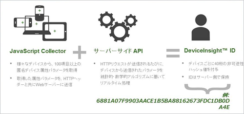 その仕組みは非常にシンプル。さまざまなデバイスから「NavigatorAppCodeName(ブラウザアプリケーションコード名)」「TimeZoneOffsetHours(タイムゾーン時差)」「ScreenWidth(画面解像度・幅)」など、多様な100個以上のパラメータを収集し、それを統計的・数学的アルゴリズムにもとづいてリアルタイム処理。デバイスごとに40桁の非可逆性ハッシュ値を付与し、それをIDとして利用してウェブサイトにアクセスしてきたデバイスを推定する。このプロセスにおいて、AdTruthは、名前や年齢、位置情報、デバイスのIDなどの個人情報に類するものをいっさい必要としない。