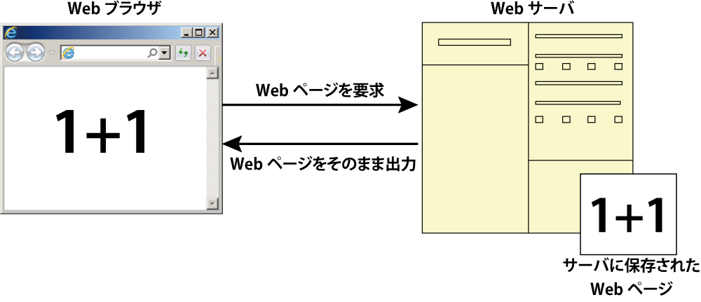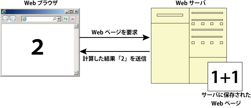 JavaScritpの項でも軽く触れましたが、プログラミングとは計算(演算)結果を出力するための記述のことです。Webの世界では、サーバで計算を実行することをサーバサイドプログラミングと呼び、ブラウザで実行することをクライアントサイドプログラミングと呼びます。そして、計算結果によって表示されるWebページを動的(ダイナミック)なコンテンツ(Webページ)と呼びます。