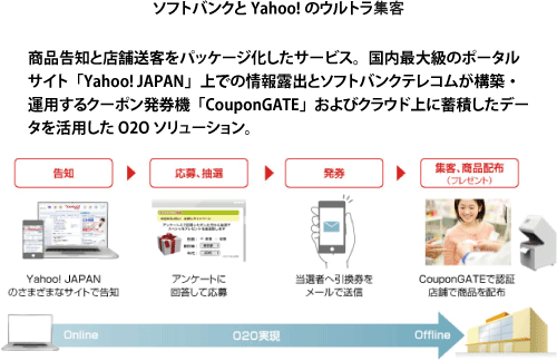 この施策はソフトバンクさんとヤフーさんのメニューである、「ウルトラ集客」を利用しています。ヤフーさんのバナー広告で告知をし、当選者は店頭の電子クーポン読み取り用の専門機械から自分の携帯やスマートフォンをかざすと、インセンティブがもらえる仕組みです。