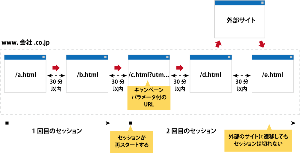 ユニバーサルアナリティクスではセッションの判定基準が変更され、外部サイトに遷移して戻ってきた場合、つまり計測対象サイトとは異なる参照元(document.referer)が発生した場合にはセッションを再スタートするようになりました。