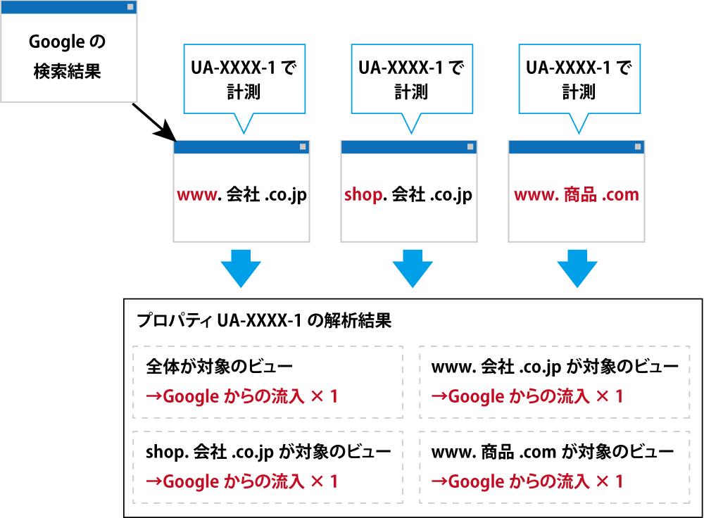 各サイト間の誘導を計測したい場合には、サイト間のリンクにイベント計測やカスタムディメンションを実装する、もしくはプロパティIDを分けて計測する、といった工夫が必要となります。