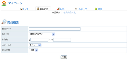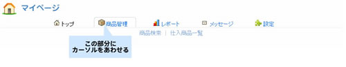 「商品管理」のタブにカーソルをあわせると、下層ページの項目が表示されるので、その中の「商品検索」をクリックします。