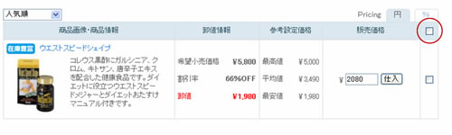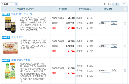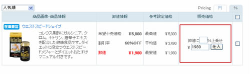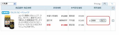仕入れたい商品が決まったら、商品レコードの「販売価格」の部分に金額を入力できるテキストエリアがあるので、その部分に販売価格(実際にコンシューマに提示して販売する最終販売価格)を入力して、【仕入】ボタンをクリックします。