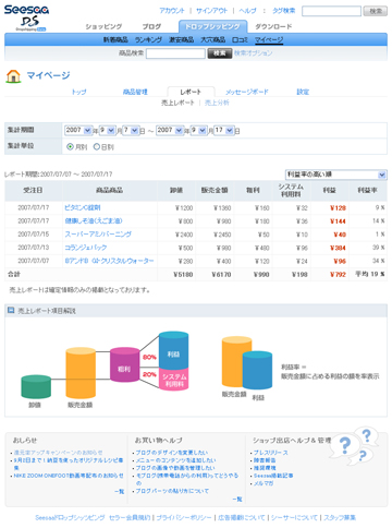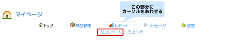 販売した商品が売れたかどうかを確認する場合には、売上レポートを利用します。売上レポートのページを確認する場合には、SeesaaDSにサインイン後、「マイページ」→「マイページトップ」と移動し、マイページ上部にあるタブの「レポート」にカーソルを合わせて、表示された下層の「売上レポート」のリンクをクリックします。