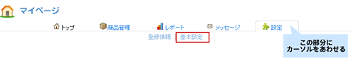 基本設定のページで各種設定を行いたい場合には、SeesaaDSにサインイン後、「マイページ」→「マイページトップ」と移動し、マイページ上部にあるタブの「設定」にカーソルを合わせて、表示された下層の「基本設定」のリンクをクリックします。