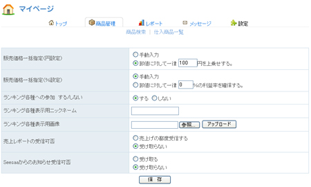 基本設定のページは上記のようになっており、このページではSesaaDSで商品を仕入れる際のデフォルト価格値の設定や、売上レポートの受け取り可否などが設定できるようになっています。各項目の内容は以下の通りです。