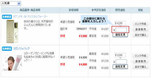 価格を編集する場合には、既に設定した販売価格の下に空白のテキストエリアが表示されているので、その部分に新たに金額を入力して、【仕入】ボタンをクリックすれば完了になります。