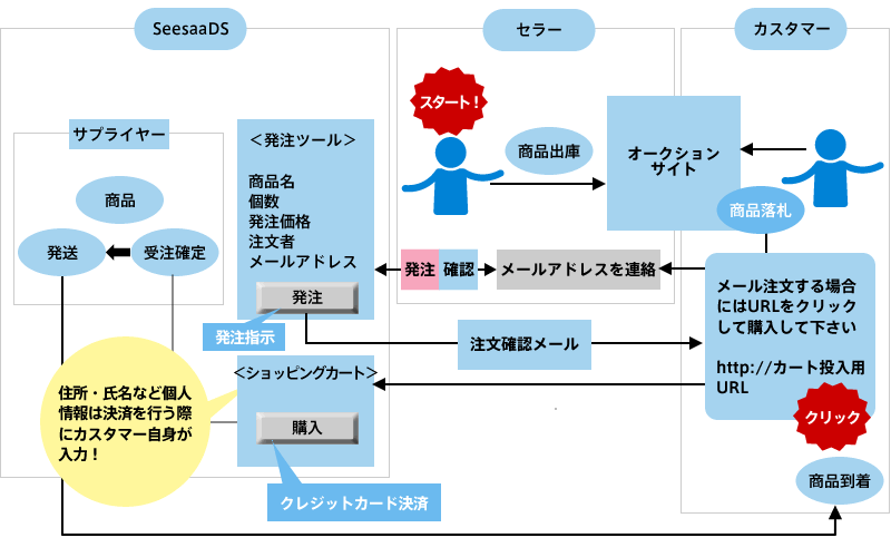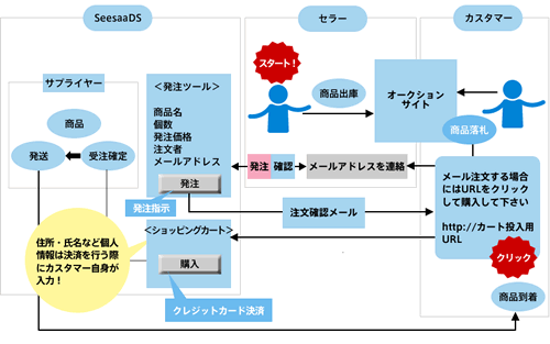 ショッピングカートに投入後、落札者が決済(支払い)を行えば、仮発注が本発注になり、サプライヤーに発注情報が渡される仕組みになっています。あとは、サプライヤーから商品が落札者に発送され(SeesaaDSの場合には、Seesaaが販売主体になっているため、Seesaaから発送されます)取引が完了することになります。