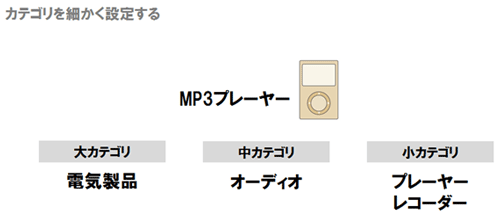 ここで理想的なカテゴリー設定を例を挙げてみましょう。例えば、MP3プレーヤーの場合は、「電気製品>オーディオ>プレーヤー、レコーダー>MP3プレーヤー」というカテゴリー構造が理想的です。一方、カテゴリーが「電気製品」または「電気製品>オーディオ」までしか設定されていない場合は、表示機会のロスに繋がってしまいます。だからこそ、このポイントをしっかりと対策することが重要なのです。