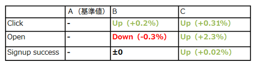 例えばあるユーザーがTwitterに誰かを招待した場合、A:”Join me on Twitter” を標準パターンとし、新しくB:”Invitation to connect on Twitter”またはC:”(ユーザー名) sent you an invitation”の3つのパターンでどれが最も効果が良いかを検証。すると、以下のような結果となった。