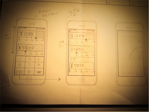 かなり使うシーンが限定されたCALFULだけれど、それもそのはず。アイディアは、馬場さんがGAPで実際に買い物をしていたときに感じた不便さから誕生したもの。選んだ商品はそれぞれ60%と30%OFF、さらにレジで総額から10%OFFという手強いセールだった。暗算するわずらわしさを感じて、CALFULを開発することを思いついた。アプリの機能性は本当にシンプルで、あくまで想定する利用シーンはセール時のお買い物。当初はいろいろ機能アイディアがてんこ盛りだったけれど、女子に長く使ってもらうにはシンプルが一番、と機能を削ぎ落としていった。必ず手書きでデザインを落とし込んで、それをもとに議論を重ねたそう。