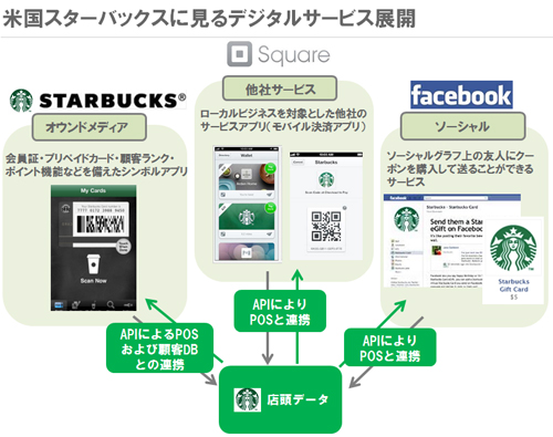 スターバックスは、こういったデジタルの施策において、頭一つ先に行っている感がありますが、その背景には新興テクノロジーベンチャーとの深い交流が挙げられます。CEOのハワード・シュルツがいま米国でもっとも注目を集めるスタートアップのひとつであるSquareの経営陣に名を連ねており、資本提携も結んでいます。また、facebookのCOOであるシェリル・サンドバーグがスターバックスの社外取締役を務めていた時期がありました(現在は退任)。