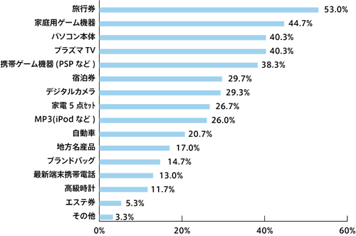 その結果、「旅行券」と回答したユーザーが最も多く53.0%。次いで、「家庭用ゲーム機器」の44.7%が続く結果となった。